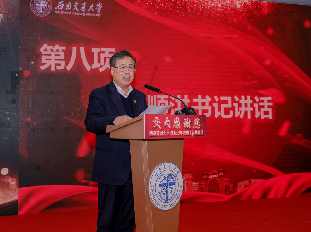 王顺洪以《桃秾李郁 岁月芳华》为题发表讲话。他表示,刚刚过去的一年,是党和国家发展史上极为重要的一年,也是学校具有里程碑意义的一年,学校这一年乃至近几十年取得的成就都是全体师生员工不懈努力、奋力拼搏的结果,饱含着大家的智慧、辛勤和汗水。他介绍了137位荣休教职工的构成,感谢他们数十年如一日奋战在立德树人第一线、管理育人第一线和服务育人第一线,为学校各项事业的蓬勃发展作出的重要贡献。他强调,学校党委一直高度重视离退休工作,把离退休工作放到学校事业发展全局中来进行谋划和落实。在学校第十五次党代会报告中,特别强调要“积极探索扶老助老服务新渠道,不断丰富离退休教职员工的精神文化生活”,并将“高度重视离退休干部、老教授疫情防控工作,切实保障老同志健康安全”列为学校2023年的重点工作。学校将进一步加强统筹保障,把老年健康驿站等方方面面工作落到实处,尽最大可能创造条件为离退休教职工多办实事,多办好事,坚决做好离退休教职工的各项服务工作,用心用情照顾好老同志,努力满足离退休教职工的多样化需求,让大家更加幸福地享受退休生活。他指出,退休既是一段职业生涯的结束,也是全新生活的开始,希望大家老有所学、老有所乐、老有所为,让习近平总书记提倡的“积极老龄观、健康老龄化”理念在西南交大得到深刻践行。同时,“荣休”并不意味着“休止、终止”,共产党员要继续发挥好作用,为学校改革建设发展发光发热。学校也将积极采取举措,为离退休教师搭建各类平台,期待大家一如既往地关心支持学校办学事业发展,助力学校加快建设“轨道交通领域世界第一的av麻豆