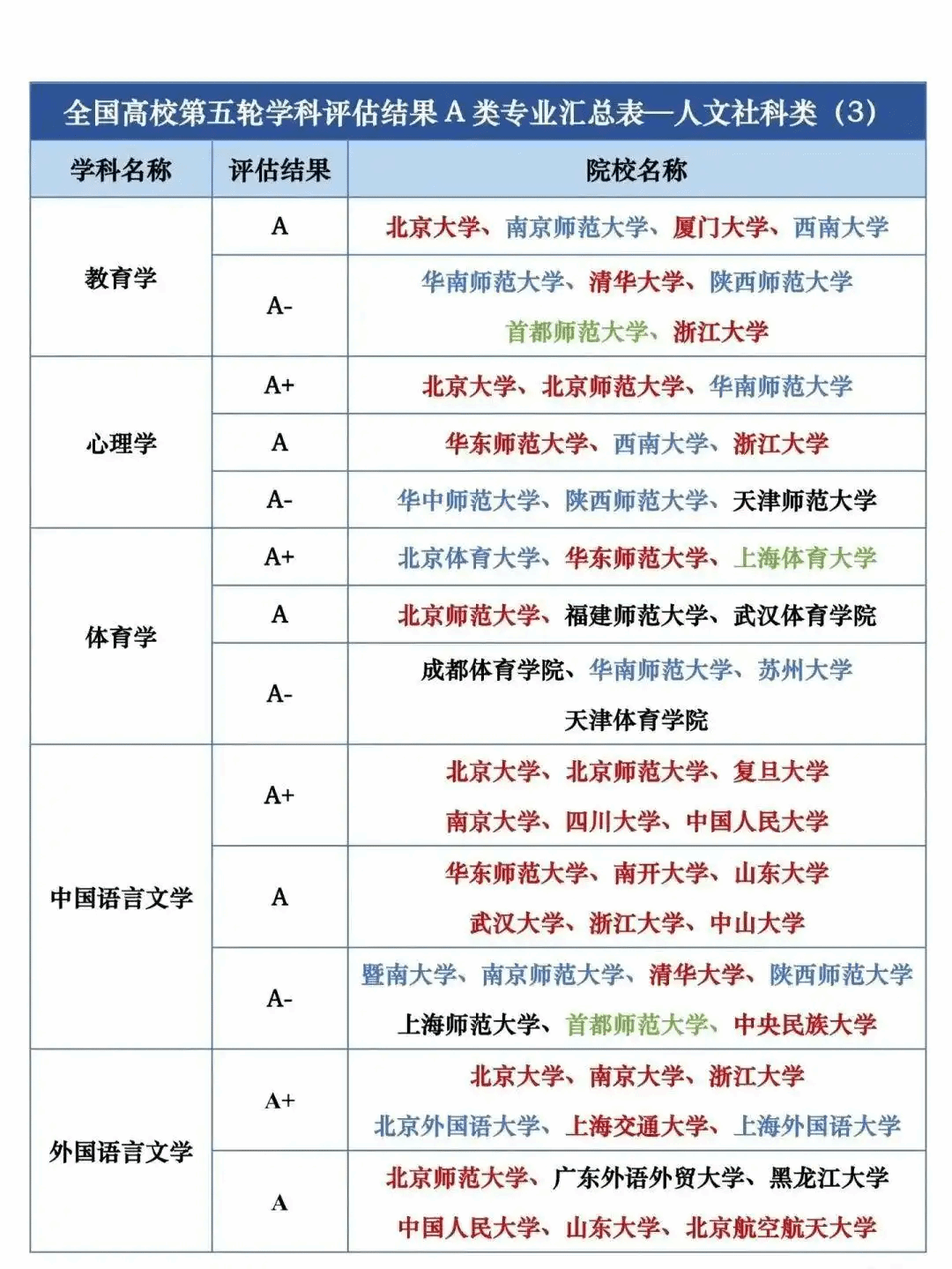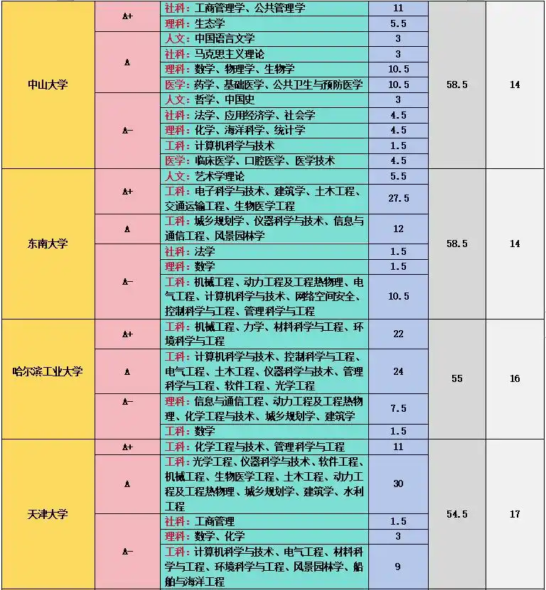 全国第五轮学科评估结果A类按照学校汇总