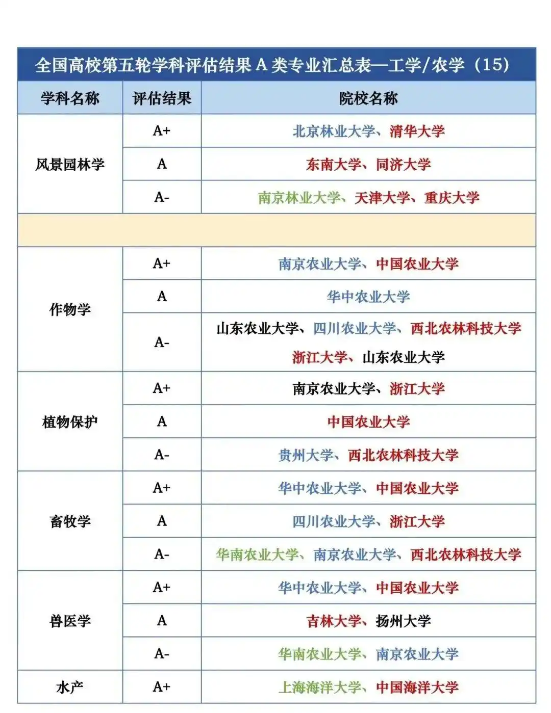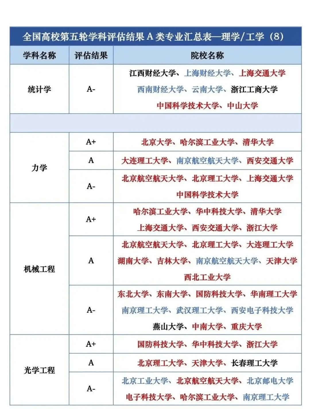 全国高校第五轮学科评估结果A类专业汇总