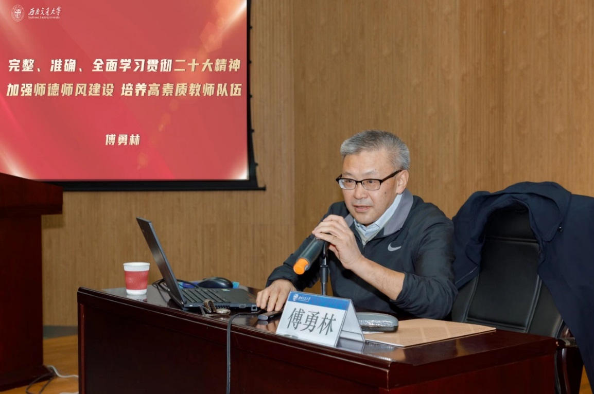 傅勇林紧紧围绕党的二十大报告,聚焦高校教育,结合成渝两地双城经济圈等国家重要发展战略及需求,全面、系统、深入地讲解了党的二十大精神。傅勇林谈到,深入实施人才强国战略,培养造就大批德才兼备的高素质人才,是国家和民族长远发展大计。傅勇林提到,教育不仅要有知识注入,还要注重人格培育和精神成长,作为高校教师,我们要努力培养造就更多大师、战略科学家、一流科技领军人才和创新团队、青年科技人才、卓越工程师、大国工匠、高技能人才,以“为党育人、为国育才”为己任。