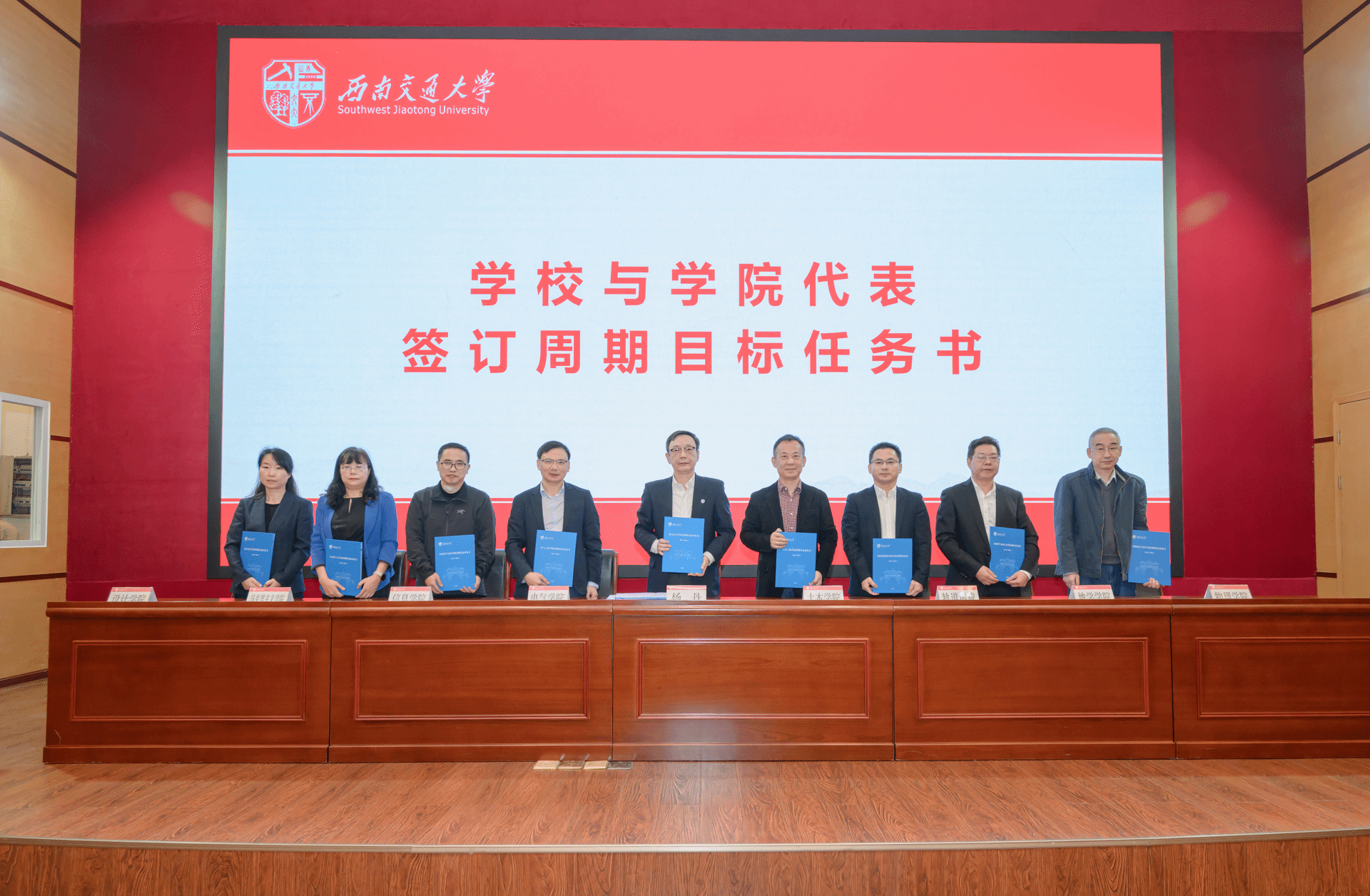 随后,杨丹代表学校与土木工程学院、电气工程学院、轨道交通运载系统全国重点实验室、信息科学与技术学院、地球科学与环境工程学院、物理科学与技术学院、马克思主义学院、设计艺术学院等8家教学科研单位代表签订周期目标任务书。