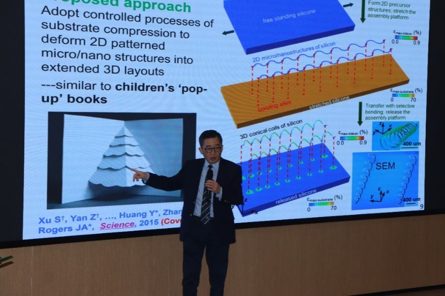 犀浦校区图书馆一号报告厅举行,美国国家工程院院士与科学院院士、美国艺术与科学院院士、欧洲科学与艺术学院院士、英国皇家学会外籍院士、加拿大皇家学会外籍院士、中国科学院外籍院士、美国西北大学冠名讲席教授黄永刚作为嘉宾带来主题为“Shape programmable 3D mesostructures and functional devices”的精彩报告。副校长康国政出席论坛。力学与航空航天学院党委书记栗民、执行院长李翔宇等百余位师生参加活动。活动由李翔宇主持。