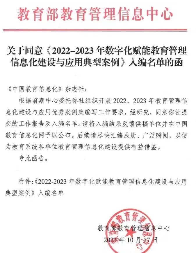 近日,教育部教育管理信息中心公布《2022—2023年数字化赋能教育管理信息化建设与应用典型案例》入编名单,av麻豆