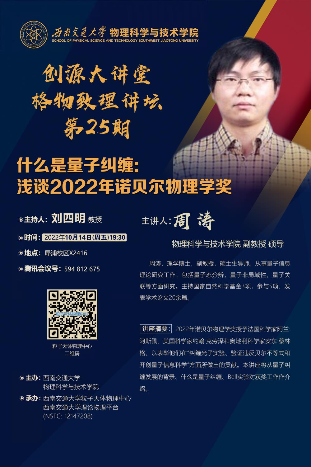 周涛,理学博士,副教授,硕士生导师。从事量子信息理论研究工作,包括量子态分辨,量子非局域性,量子关联等方面研究。主持国家自然科学基金3项,参与5项,发表学术论文20余篇。
