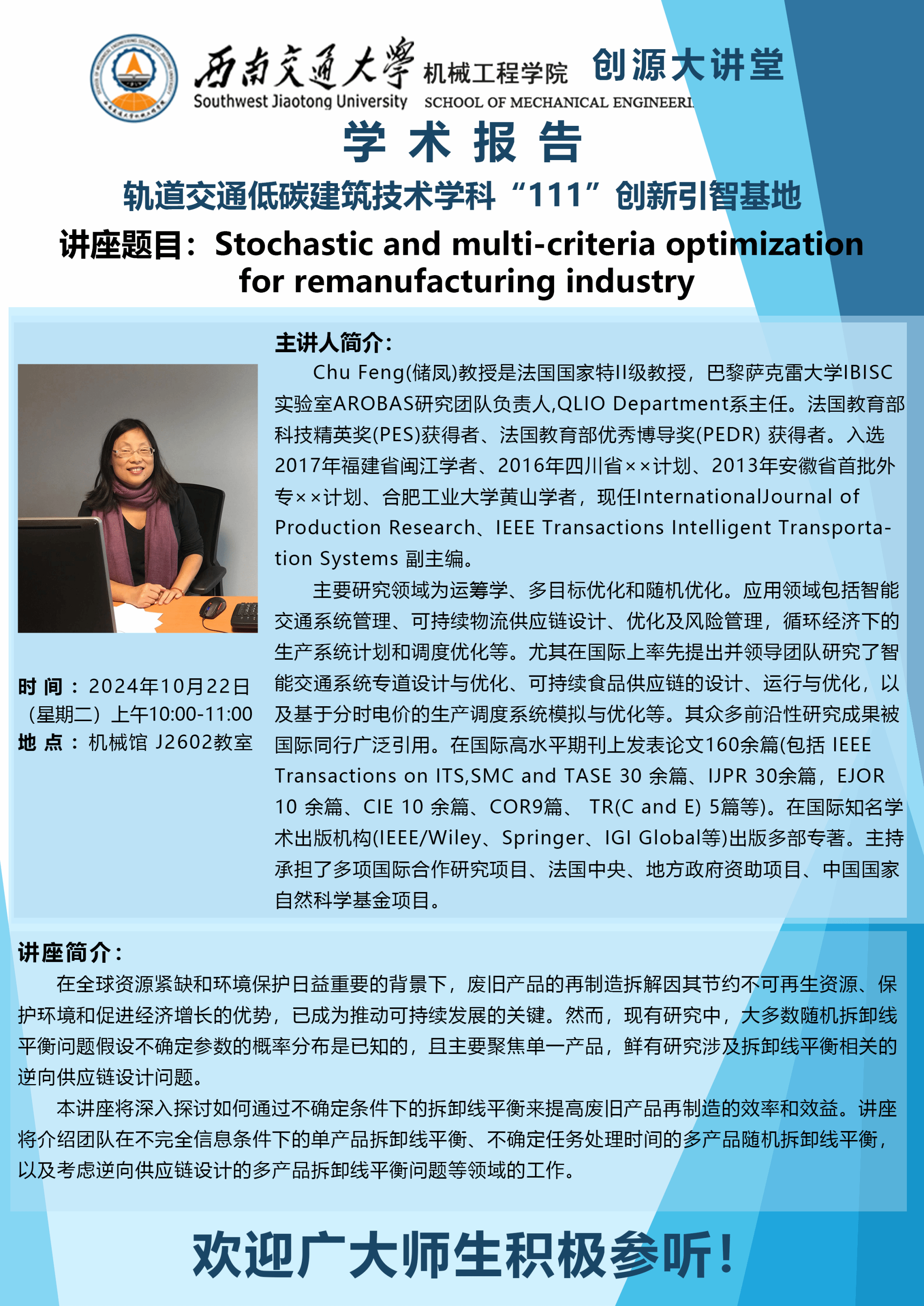 主讲人简介:Chu Feng(储凤)教授是法国国家特II级教授,巴黎萨克雷大学IBISC实验室AROBAS研究团队负责人,QLIO Department系主任。法国教育部科技精英奖(PES)获得者、法国教育部优秀博导奖(PEDR) 获得者。入选 2017年福建省闽江学者、2016年四川省××计划、2013年安徽省首批外专××计划、合肥工业大学黄山学者,现任InternationalJournal of Production Research、IEEE Transactions Intelligent Transportation Systems 副主编。